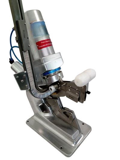 Fechamento semi-automático de tripas individuais no calibre máximo de 150mm. de diâmetro, tornando-as seguras, garantindo o fechamento do produto no processo de industrialização. Este equipamento é específico para embutidos como, salame, presunto, mortadela, etc.